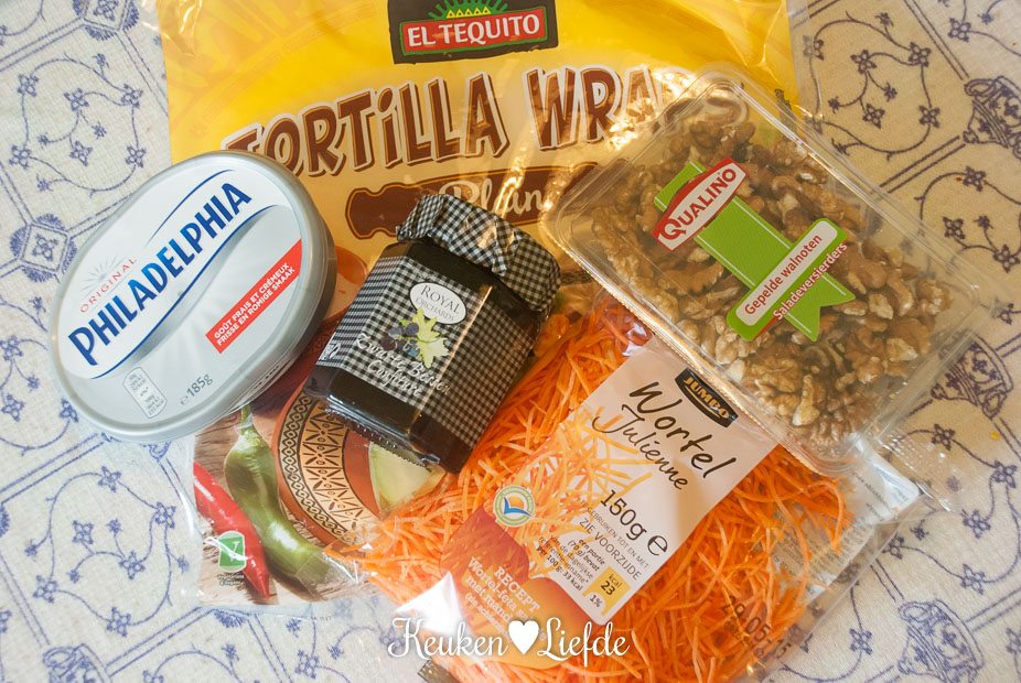 Het valt niet altijd mee om de broodtrommel van je kinderen dagelijks gevarieerd te vullen. Ella-Marie is bijvoorbeeld geen grote broodeter; elke dag een sneetje brood hoeft voor haar niet. Daarom wissel ik haar boterham zo nu en dan af met een lunchwrap – deze smakelijke variant met roomkaas, wortel en walnoten is haar (en ook mama’s!) favoriet.