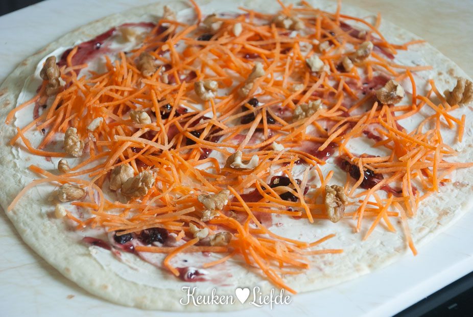 Schil of schrap de wortel en rasp in dunne slierten. Besmeer de wrap met de roomkaas en jam en beleg met de wortel en walnoten.