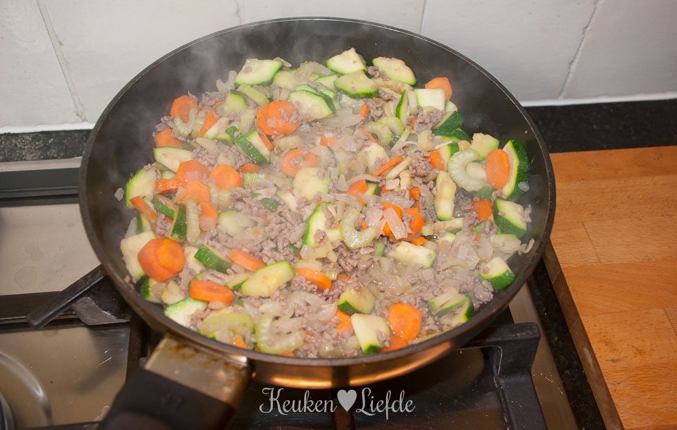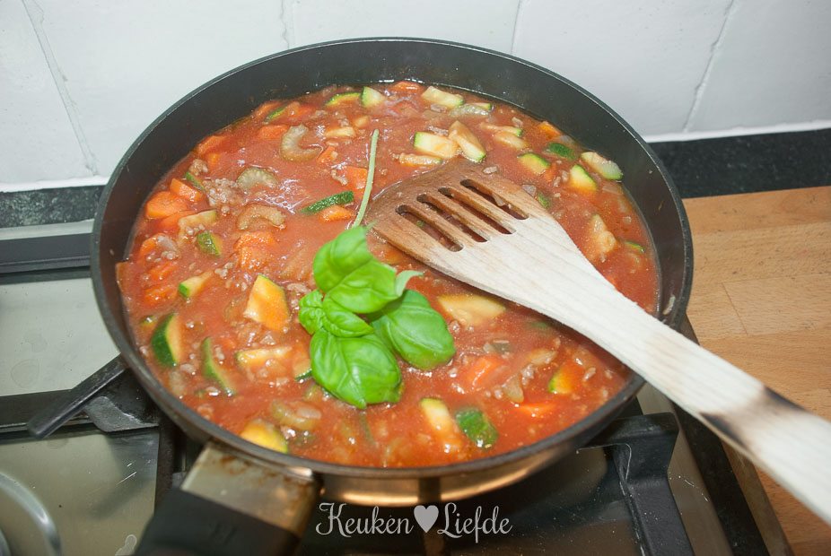 Verhit de koekenpan met wat olie en fruit de ui en knoflook, totdat ze zacht zijn. Zet het vuur wat hoger en voeg de groenten toe. Bak verder, totdat ook de groenten wat zachter zijn en voeg dan het gehakt toe. Bak het gehakt rul. Voeg de gezeefde tomaten, suiker, basilicum en wat zout en peper toe en laat op laag vuur circa 10 minuten zachtjes pruttelen.