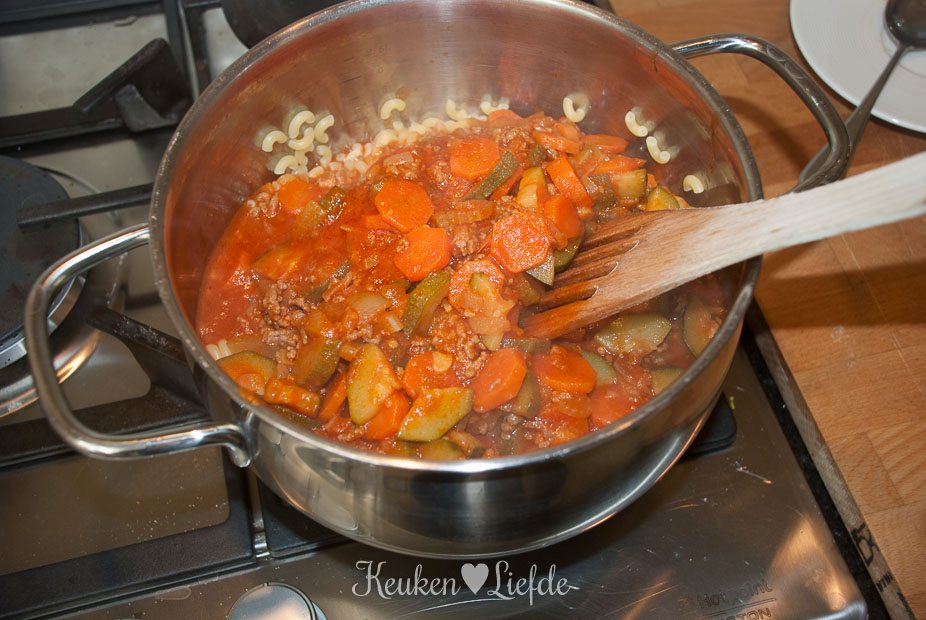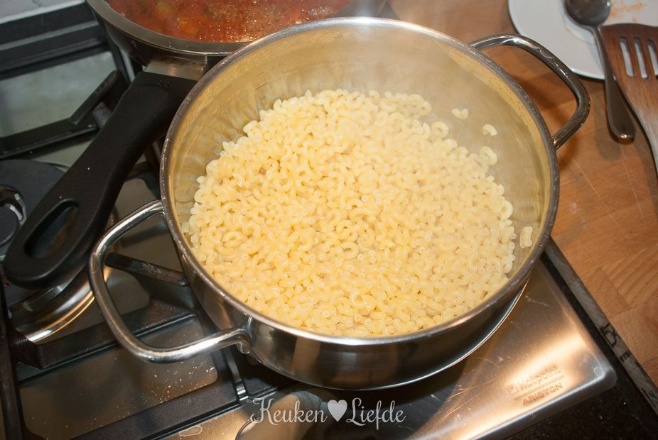 Kook ondertussen de macaroni iets harder dan beetgaar. Giet de macaroni af en doe terug in de pan. Voeg de tomaten-gehaktsaus toe aan de macaroni en voeg de mozzarella toe.