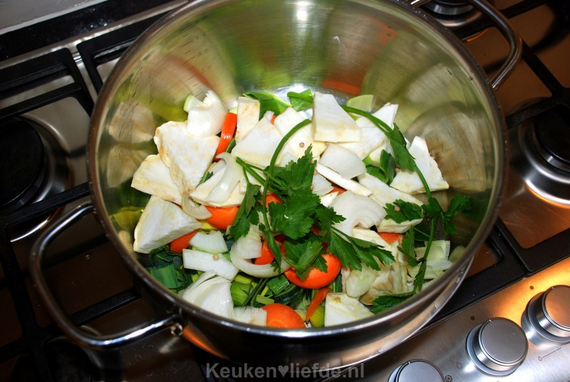 Doe alle ingrediënten in een grote pan en schenk er 2 liter koud water bij.