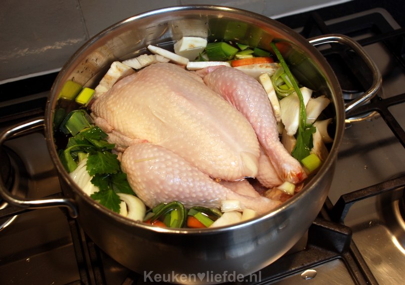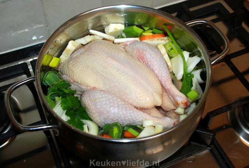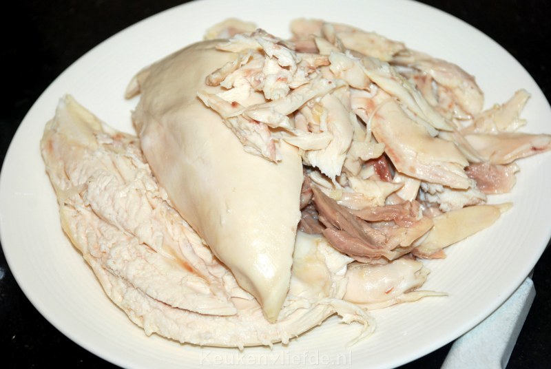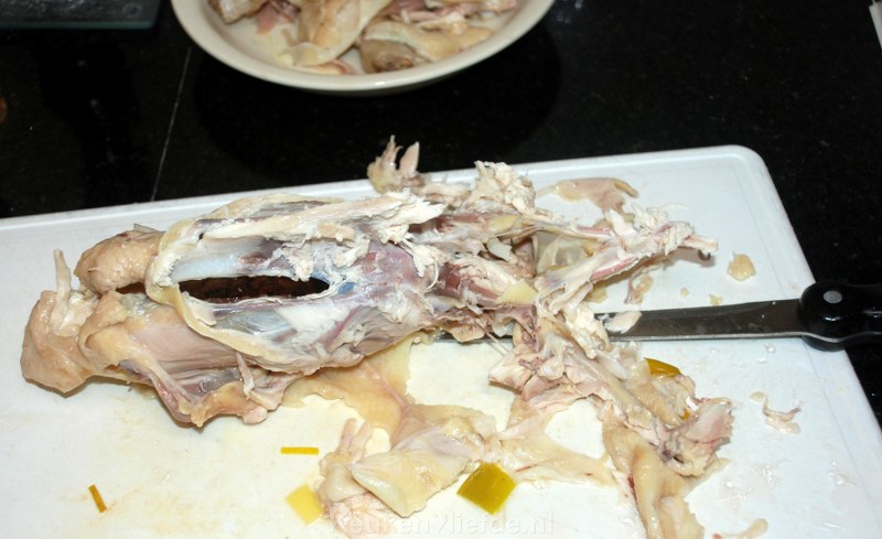 Breng het water aan de kook en zet de pan, met de deksel erop, op het allerlaagste vuur. Laat de bouillon zachtjes trekken. Als de kip gaar is – na ongeveer een uur – haal je hem uit de bouillon en laat hem afkoelen. Pluk de kip en doe het kipafval weer terug bij de bouillon.