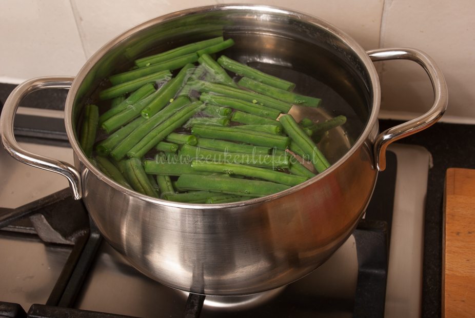 Breng een pan met licht gezouten water aan de kook. Snijd de puntjes van de sperziebonen af en halveer ze. Was de sperziebonen en kook ze nog net niet gaar. Giet de sperziebonen af en spoel met koud water om het garingsproces te stoppen. Laat goed uitlekken.