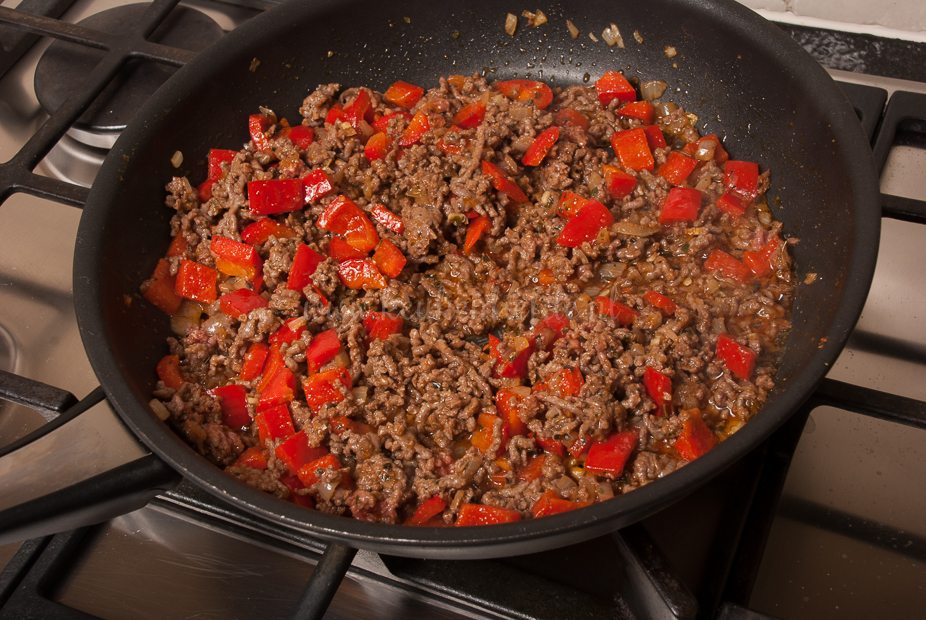 Verhit een koekenpan met wat olie en fruit de ui, knoflook en paprika zachtjes aan, totdat de ui zacht is. Voeg het gehakt en de kruiden toe en bak enkele minuten mee. Voeg circa 2/3 van de tomatenfritto, sperziebonen en maiskorrels toe en warm alles kort even door. Breng indien nodig extra op smaak met zout en peper. Zet het vuur uit.