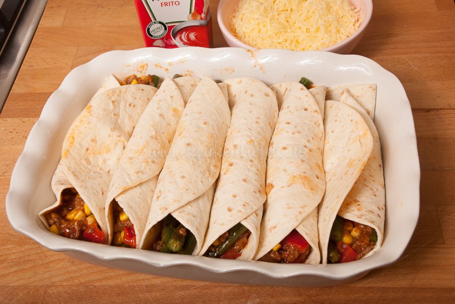 Verdeel het gehaktmengsel over 6 tortillawraps en leg in de ovenschaal. Bestrijk de bovenkant met de overige tomatenfritto en bestrooi met de geraspte kaas.