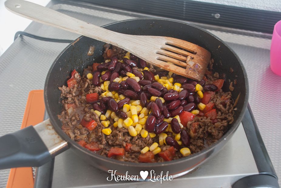 Verhit een ruime koekenpan met wat olie en fruit de ui, paprika en knoflook, totdat ze zacht maar niet bruin zijn. Breng op smaak met peper en zout. Voeg de kruiden toe en bak even mee. Voeg het gehakt toe en bak rul. Breng nogmaals goed op smaak met peper en zout. Voeg de bonen en mais toe en warm alles goed door.