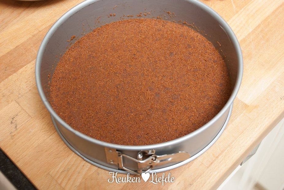 Vet de bakvorm in met boter en bekleed de bodem met bakpapier. Maal de koekjes fijn in de keukenmachine en smelt de boter in een pan op laag vuur. Roer de verkruimelde koekjes door de gesmolten boter en meng goed door. Verdeel dit mengsel over de bodem van de springvorm en druk goed aan. Zet zolang in de koelkast.