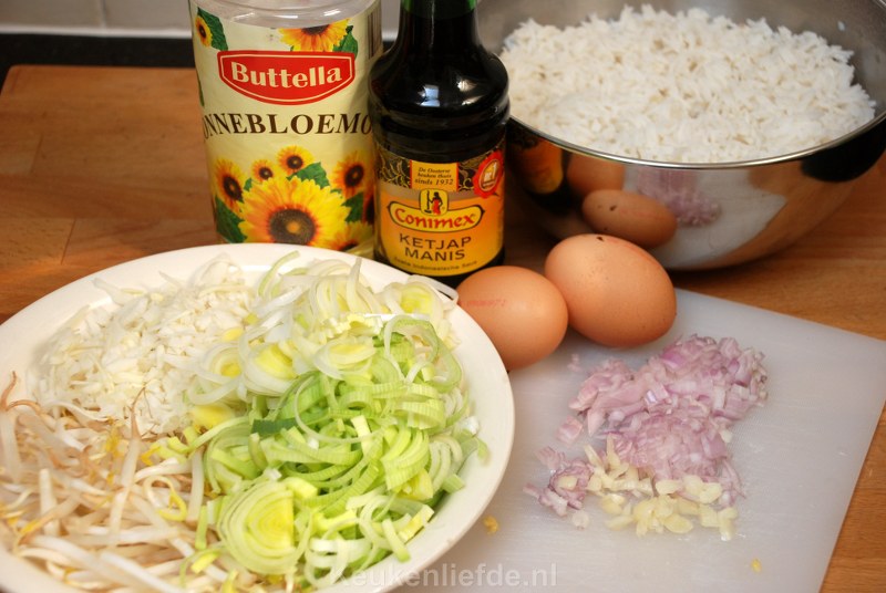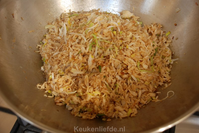 Zet het vuur direct uit zodra de omelet gestold is en bewaar de omelet zolang op een bord. Veeg de wok schoon met een stukje keukenpapier en verhit opnieuw met een scheutje olie. Fruit het sjalotje en knoflook totdat ze zacht zijn op laag vuur. Voeg dan de witte kool en prei toe en zet het vuur hoger. Bak totdat ze zacht zijn. Voeg tenslotte de taugé en de rijst toe en roerbak alles totdat de rijst door en door warm is.