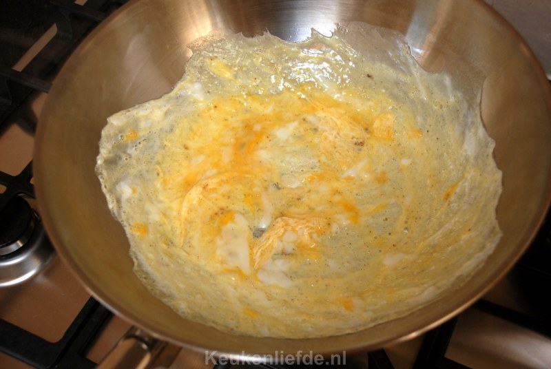 Klop de eieren los met wat peper en zout. Verhit wat olie in de wokpan en giet het eimengsel in de wok. Maak direct een draaiende beweging zodat je het ei zo dun mogelijk verdeelt.