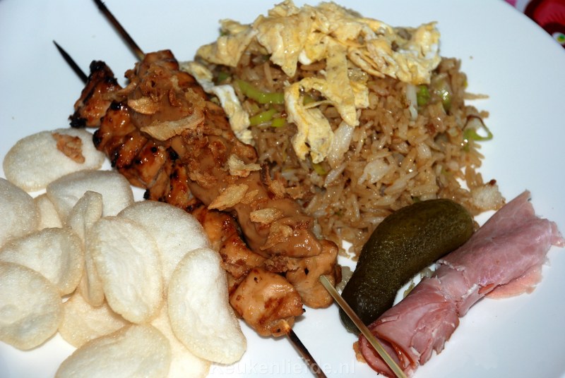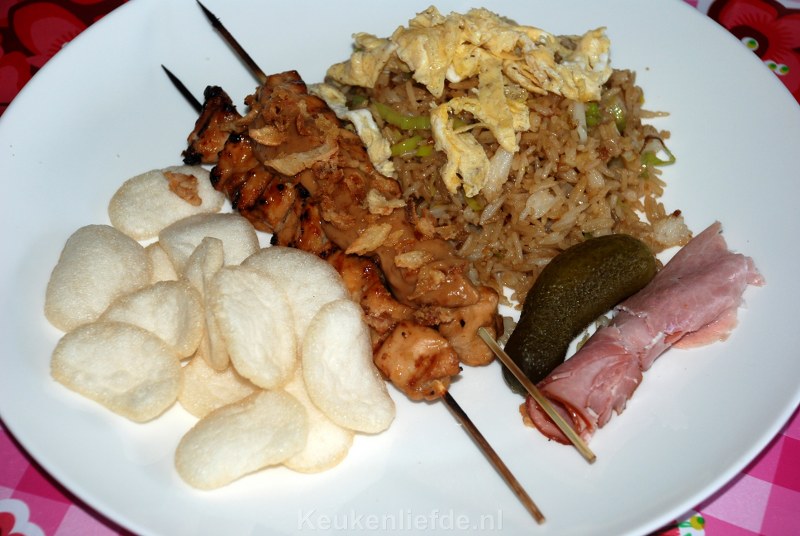 Je kunt de nasi goreng eventueel nog uitbreiden met sateetjes, pindasaus, wat tafelzuur zoals atjar of augurken, gefrituurde uitjes, kroepoek en rolletjes ham. Op deze manier maak je van deze eenvoudige nasi goreng een waar feestmaal!