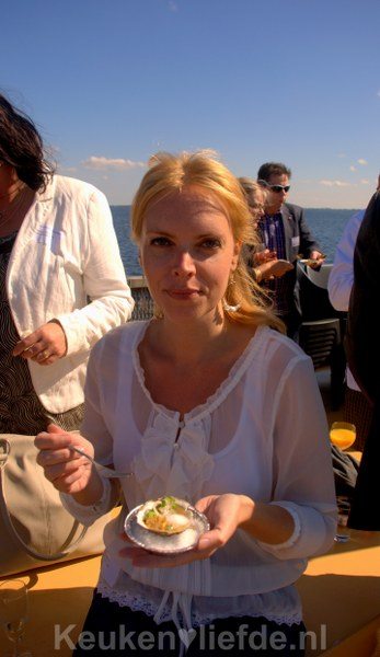 Dan is het tijd om oesters te proeven! Voor mij spannend, want nooit eerder durfde ik me aan deze zilte zaligheid te wagen. Maar gelukkig schotelde niemand minder dan Jacob Jan Boerma, chef-kok van driesterrenrestaurant De Leest uit Vaassen, ons op de boot een uitzonderlijke oesterbereiding voor – voor eens en voor altijd heeft hij me bevrijd van mijn hardnekkige oesterangst. Hoewel ik op de gefermenteerde algen na alweer vergeten ben welke ingrediënten hij gebruikte (sorry Jacob Jan, dat moet aan de smaakbetovering liggen, want volgens mij heb je het me verteld), was ik op slag verliefd op de smaak en slurpte ik direct de oester uit zijn schelp.