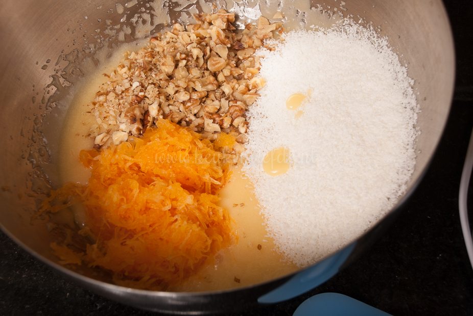 Klop de zonnebloemolie met de fijne kristalsuiker in een kom een minuut met de mixer. Voeg kloppend op lage snelheid het eimengsel toe. Meng er de walnoten, kokos en pompoen door, gevolgd door het bloemmengsel. Meng niet te lang.
