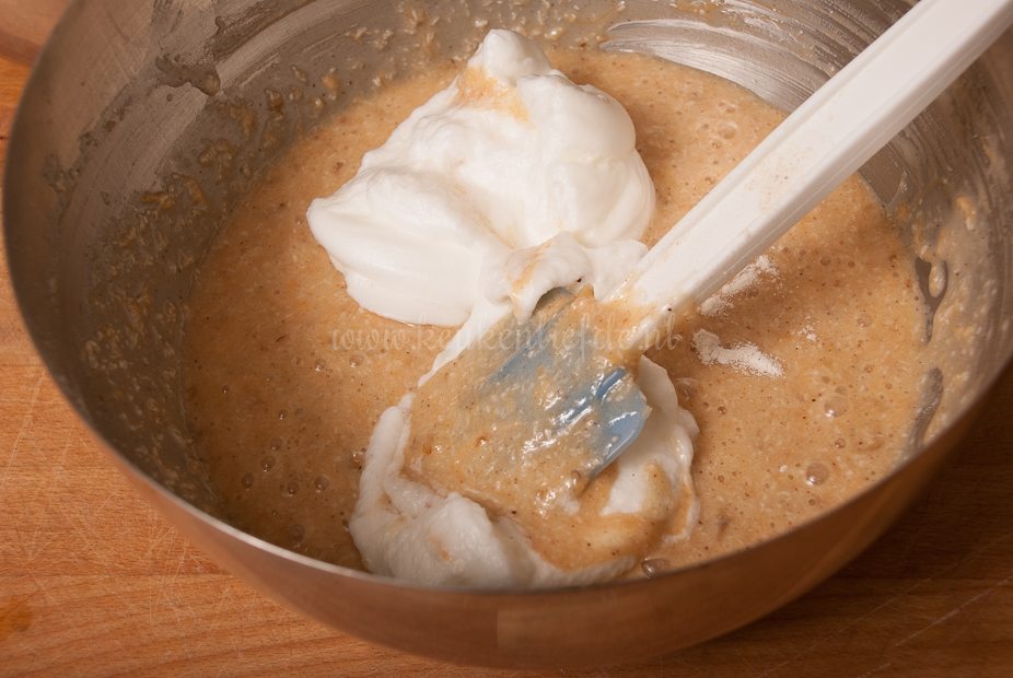 Klop met een schone mixer in een schone kom de eiwitten met het zout tot er stevige pieken ontstaan. Spatel het eiwitschuim in drie porties door het pompoenbeslag, meng niet te lang.