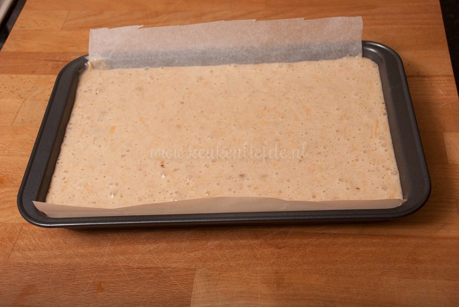 Giet het beslag in de vorm en strijk de bovenkant glad. Bak de taart gaar in ongeveer 50 minuten gaar. Laat de taart in de vorm afkoelen en haal hem er dan pas uit.