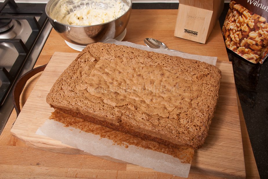 Klop als de taart volledig is afgekoeld de roomkaas luchtig en glad. Klop in een andere kom de boter met de poedersuiker en honing licht en luchtig. Spatel vervolgens beide mengsels door elkaar. Strijk het glazuur over de taart en bestrooi met de verkruimelde walnoten.
