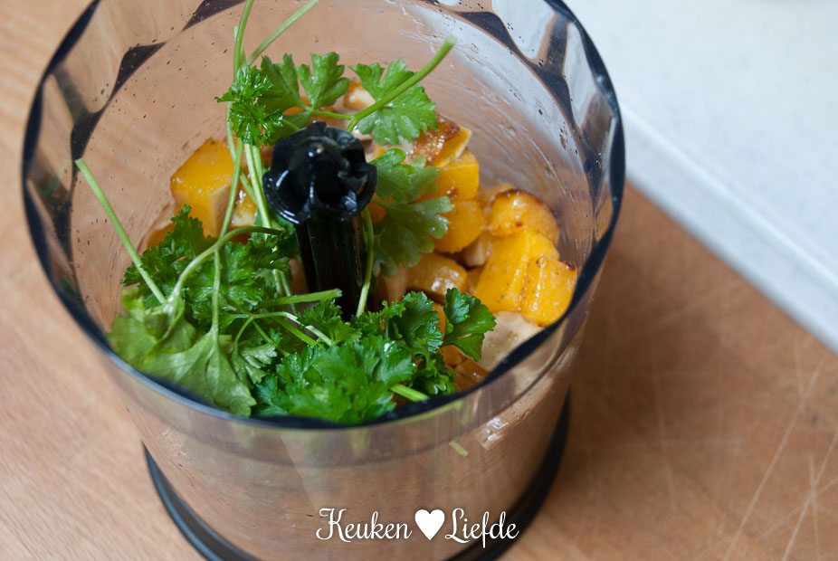 Druk de gepofte knoflook uit het velletje. Pureer de afgekoelde pompoen, gepofte knoflook, peterselie, kneep citroensap en een paar eetlepels tahin, in de keukenmachine tot een gladde, dikke puree.