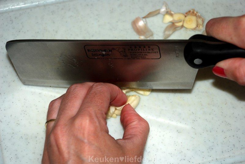 Pel de knoflook, plet met een mes en hak hem fijn.