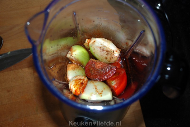 Gooi alle ingrediënten in de blender en pureer tot een gladde saus.