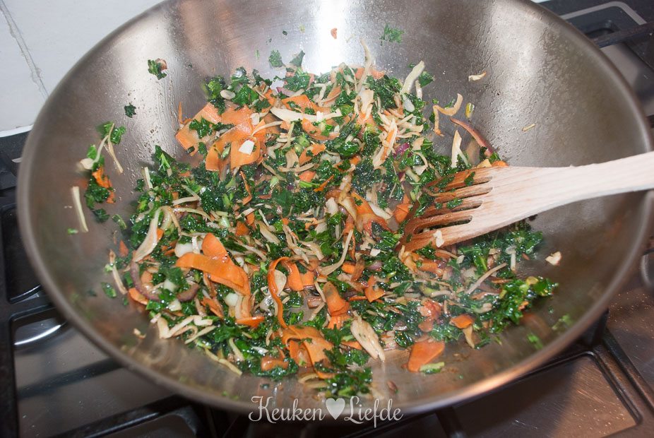 - 400 g boerenkoolroerbakmix (of zelf witte kool, wortel, boerenkool en rode ui snijden)