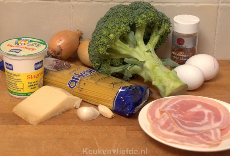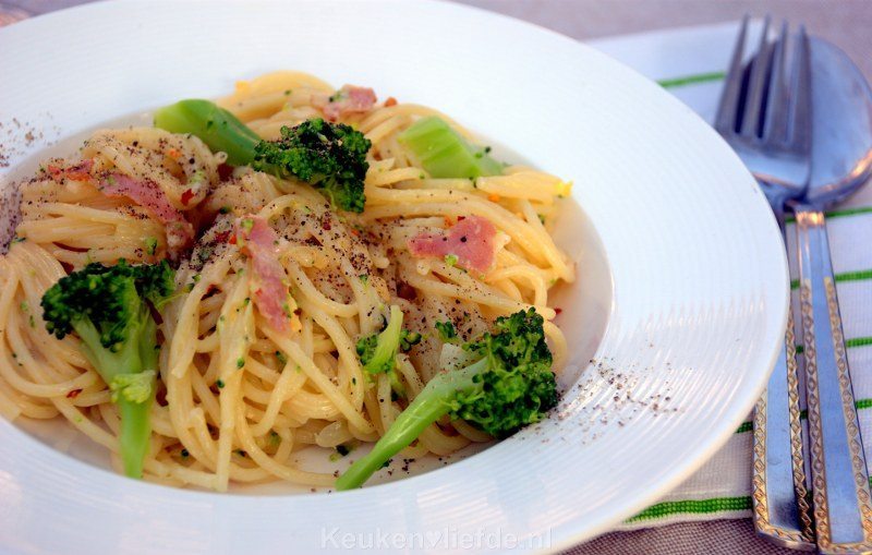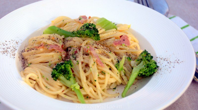 Spaghetti carbonara met broccoli en chili