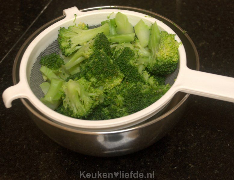 Kook de broccoli beetgaar en laat uitlekken in een vergiet, vang een kopje kookvocht op en bewaar.