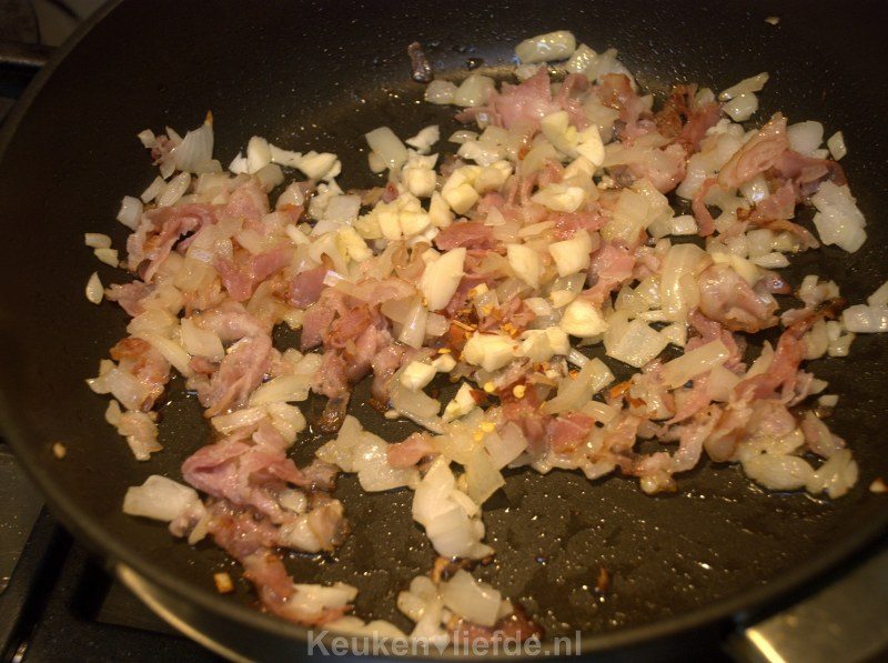 Verhit een hapjespan met wat olie en fruit op laag vuur het ontbijtspek, ui, knoflook en chilivlokken totdat de ui zacht is en het spek licht goudbruin begint te kleuren.
