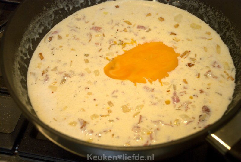 Roer de eidooiers en de helft van de geraspte kaas door de saus en warm, al roerend op laag vuur, even door.