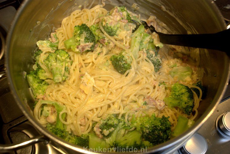 Kook ondertussen de spaghetti beetgaar. Voeg de room toe aan het ui-mengsel en laat de saus iets indikken. Giet de spaghetti af en doe samen met het opgevangen kopje kookvocht en de broccoli weer terug in de pan, roer de pasta even los.