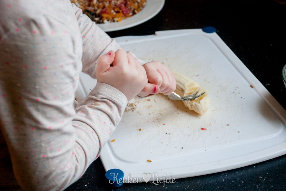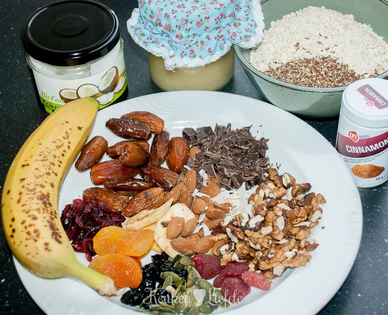 - Handje gedroogd fruit (ik gebruikte abrikozen, banaan, blauwe bessen en aardbeien)