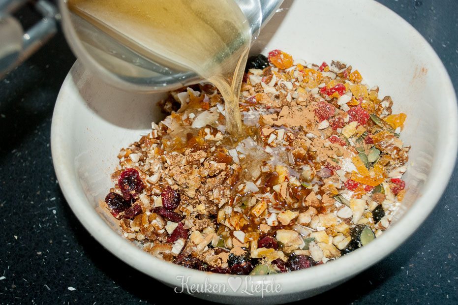 Bak de muesli in circa 20 tot 30 minuten goudbruin. Haal uit de oven en laat afkoelen. Snijd de muesli in repen en bewaar in een luchtdichte trommel of zak.