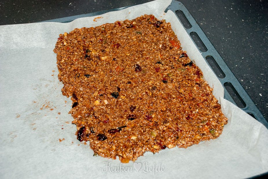 Meng alle ingrediënten in een kom goed elkaar en spreid uit over het bakblik. Druk goed aan.