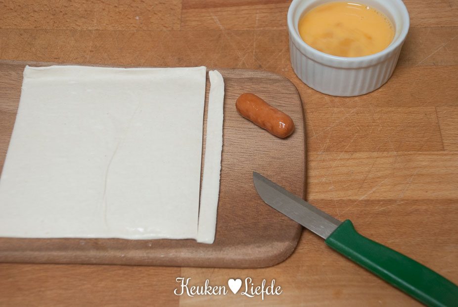 Bak 15 tot 20 minuten in de oven, of totdat het bladerdeeg licht goudbruin is. Serveer met ketchup en mosterd.