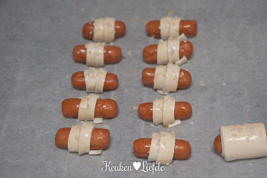 Snijd het bladerdeeg in smalle repen. (Als het bladerdeeg volledig is ontdooid, gaat dit erg lastig.) Rol de reepjes bladerdeeg om de knakworstje en leg ze op een met bakpapier bekleed bakblik. Bestrijk het bladerdeeg met losgeklopt ei en bestrooi met de sesamzaadjes.