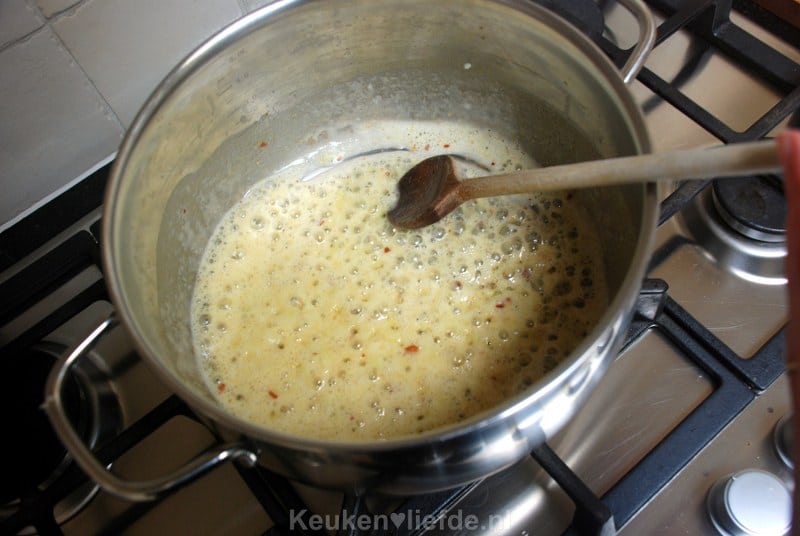 Voeg de bouillon en melk toe en laat 20 minuten zacht koken.