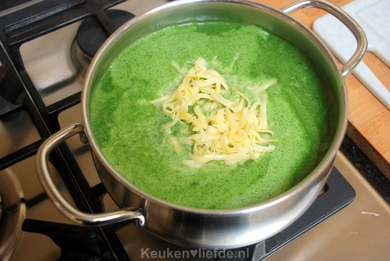 Pureer de soep, doe hem terug in de pan en roer de kaas erdoor.