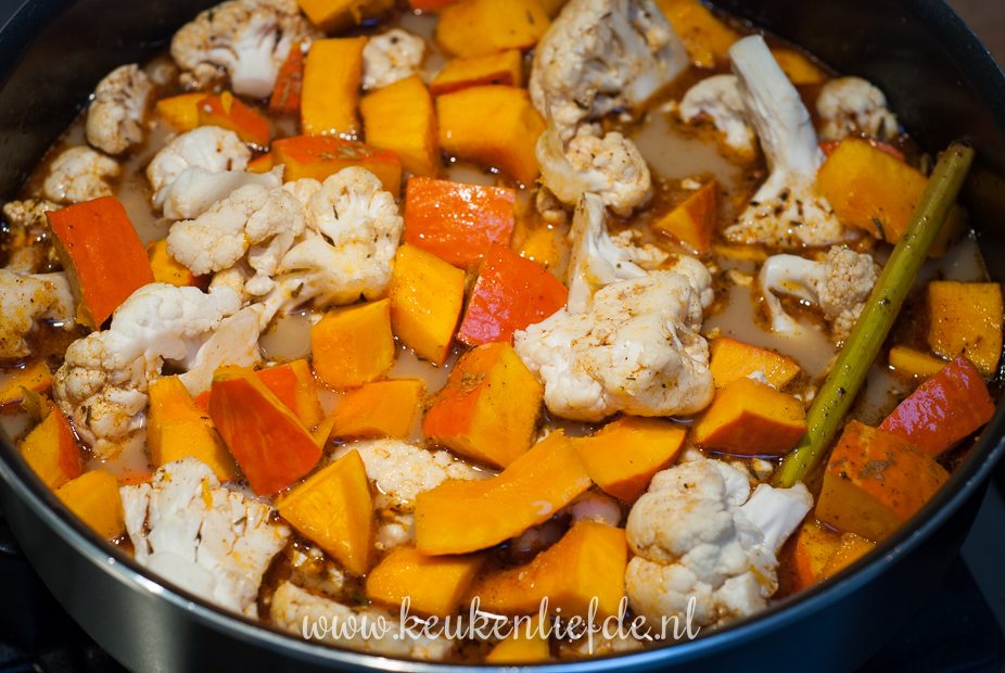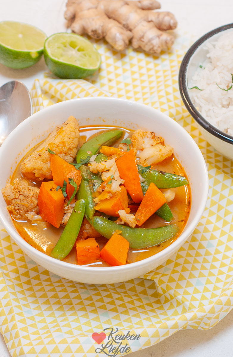 Ik ben dol op een goede curry. Het is makkelijk om te maken, staat snel op tafel en je kunt er eindeloos mee variëren. Omdat ik in januari altijd extra veel zin heb in licht en gezond eten, maak ik een vega Thaise rode groentecurry met pompoen, bloemkool en sugar snaps. Lekker om te serveren met rijst en noedels.