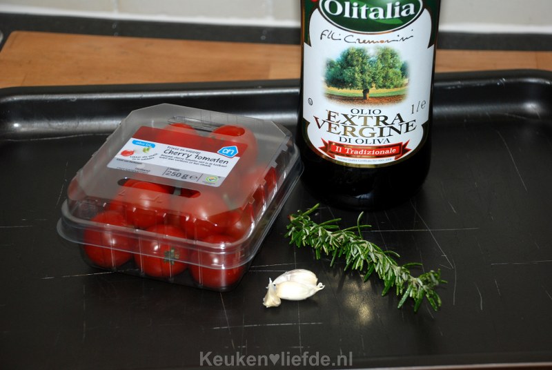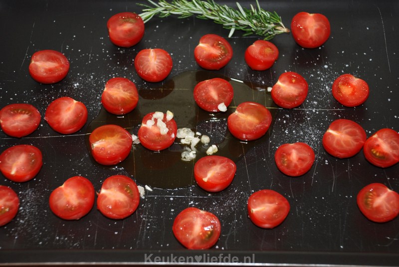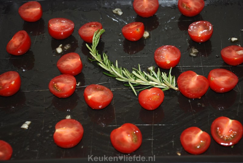 Besprenkel de tomaten met olijfolie en wat grof gemalen zeezout. Leg het takje rozemarijn erbij en hussel alles met je handen door elkaar. Verspreid de tomaten over het bakblik en leg ze met de snijkant naar boven.