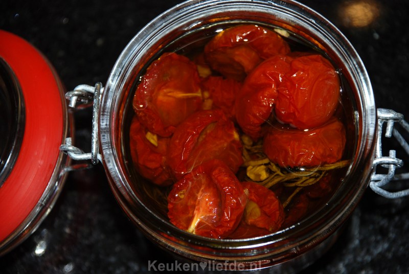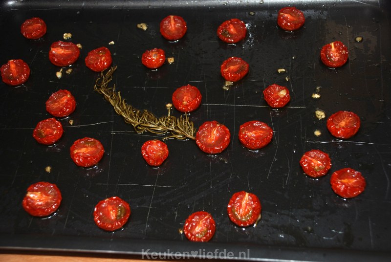 Laat de tomaten ongeveer 5 uur drogen. Je kunt de oventijd ook verkorten door de ovendeur op een kiertje te zetten. Omdat er bij mij een kleine nieuwsgierige aap in de keuken rondliep was dat geen optie… Er mag bijna geen vocht meer in de tomaten zitten maar ze moeten ook niet helemaal hard zijn. Controleer af en toe even of het goed gaat.