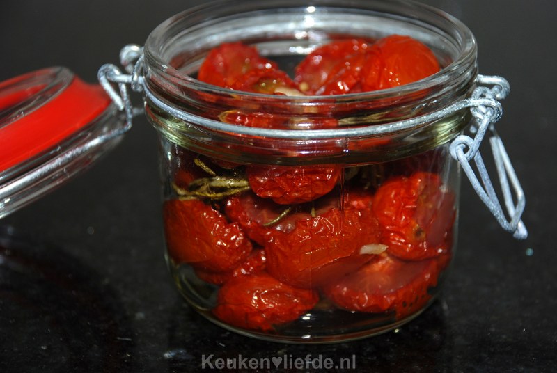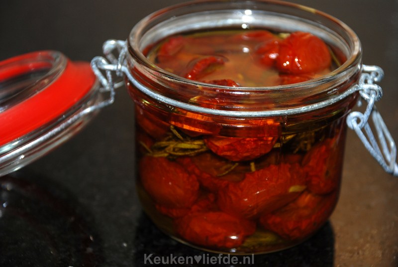 Bewaar de tomaten met de knoflook en rozemarijn in een schoongemaakte afsluitbare pot en giet er olijfolie overheen totdat ze net onder staan.