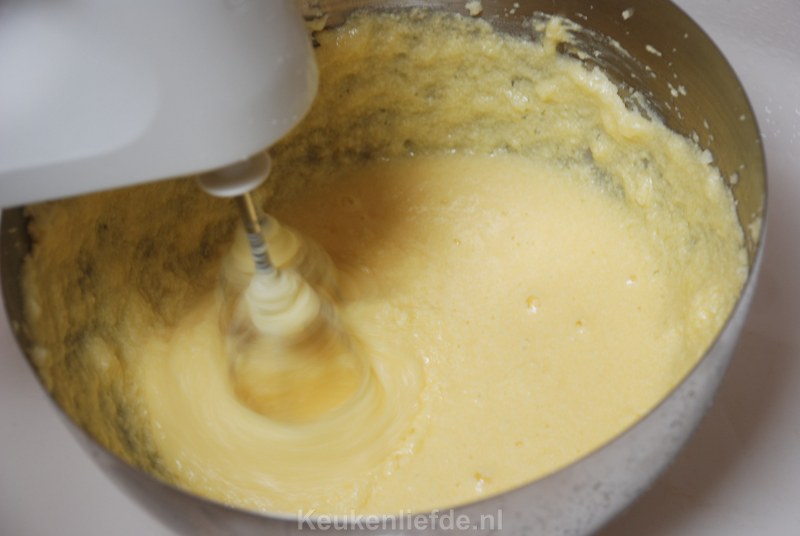 Zeef de bloem erboven en roer dit met een spatel voorzichtig door het beslag. Spatel als laatste de sinaasappelrasp door het beslag.