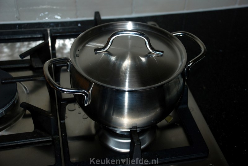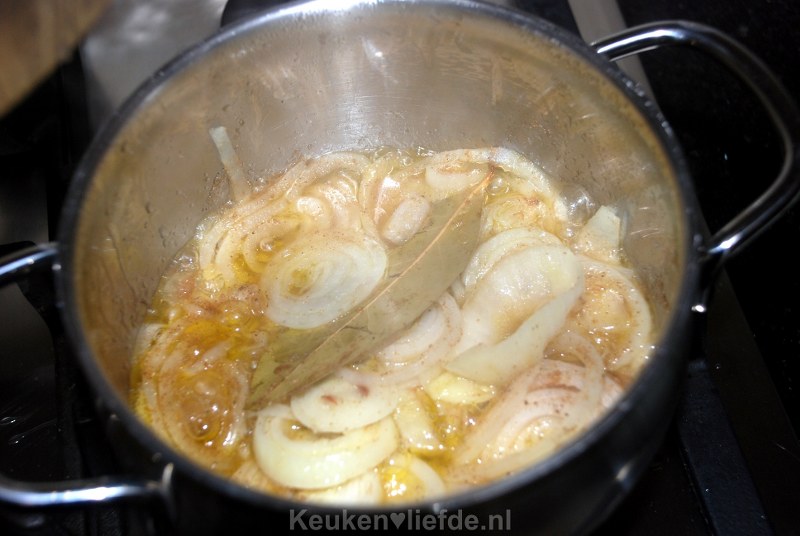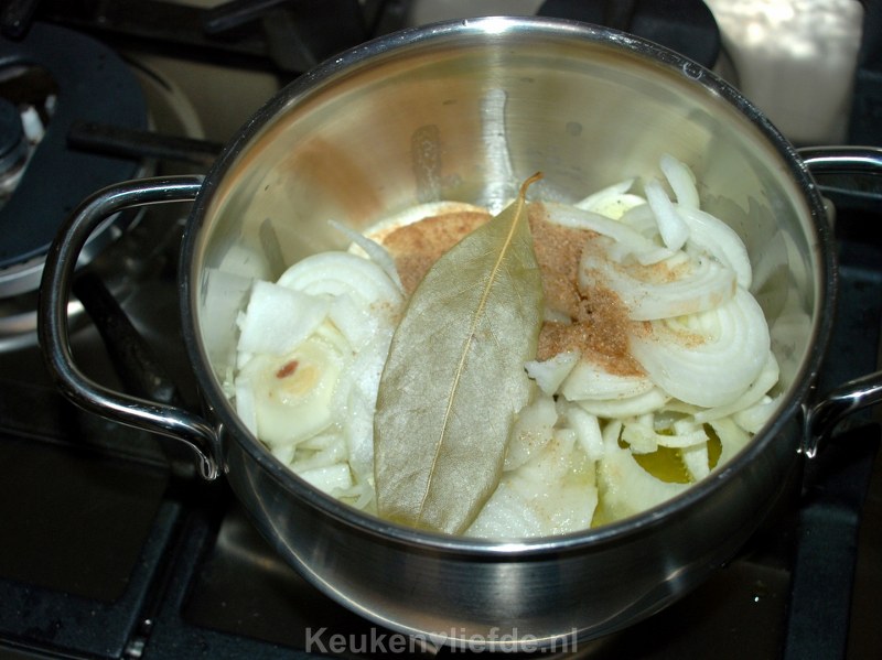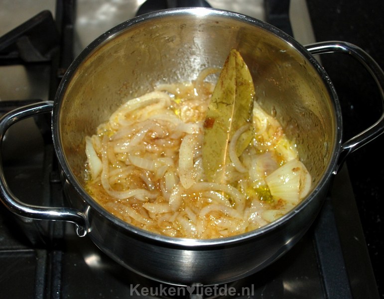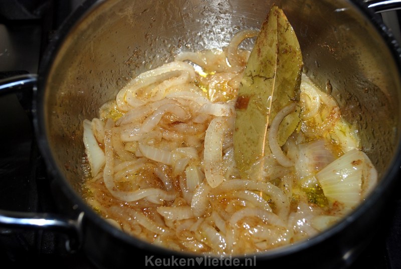 Roer goed door, doe de deksel op de pan en laat op een laag vuur ongeveer 10 minuten zachtjes pruttelen. Af en toe even roeren, de uien mogen niet bruin worden.