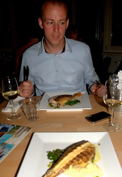 Dan het prachtige hoofdgerecht: een hele rode poon (gevangen via de Flyshoot-methode, een economisch en ecologisch verantwoorde vistechniek) met krakend krokante frietjes van Westhoeve Potatoes. Als frietkenners (in huize Verweij zijn we dol op onze eigen eigengemaakte frietjes, die we na vele uren geëxperimenteer bestempelen als de allerallerlekkerste friet ter wereld) stellen we vast dat deze frietjes wel heel dicht in de buurt komen bij de smaaksensatie van ons eigen huismerk: Verweij-friet. Maar misschien overtreft deze friet stiekem wel die van ons … Het is bijna zonde om deze frietjes als bijgerecht te serveren – serveer ze als hoofgerecht met wat mayonaise en het smulfeest is compleet. (Gelukkig kan onze dochter dit nog niet lezen.) Helaas ben ik vergeten een foto te maken van de frietjes, maar je kunt wel raden waar Johan naar kijkt…