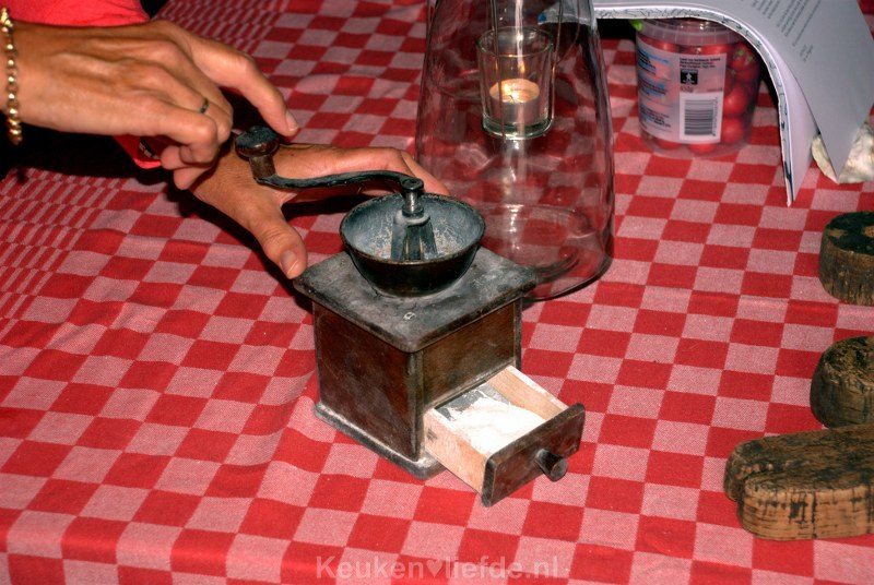 We ronden de buitengewone verwennerij af met vers gezette koffie uit deze ouderwetse koffiemolen.