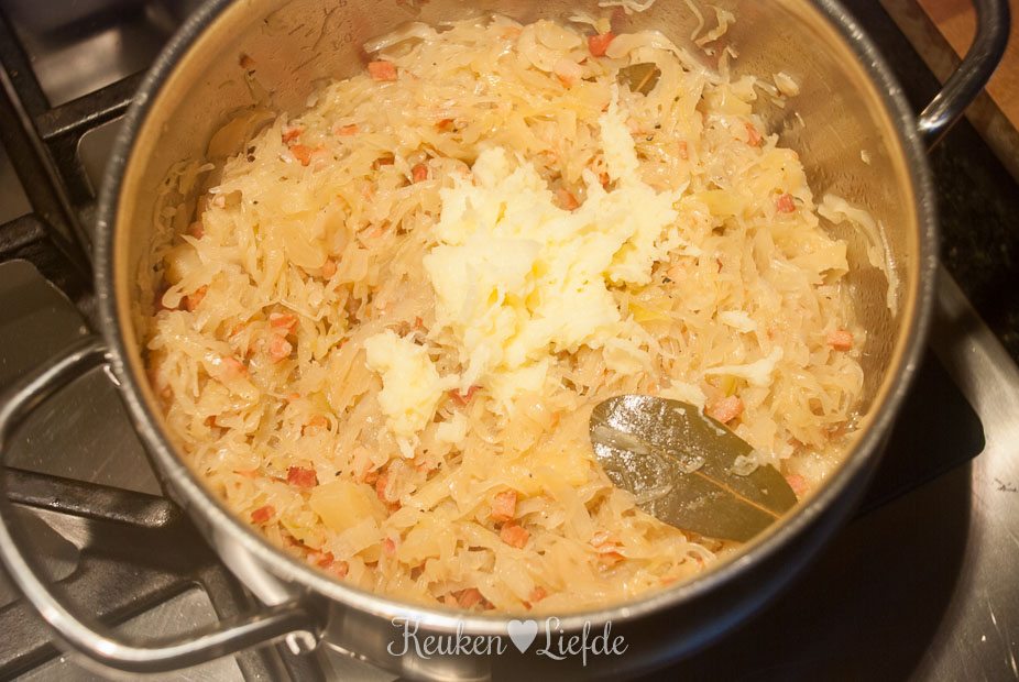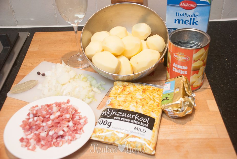 Verhit een pan met wat olie en een klontje boter en fruit op laag vuur de ui, laurier, jeneverbessen en spekblokjes, totdat de ui zacht is. Voeg de zuurkool en ananasblokjes toe (zoveel als je zelf wilt) en roer door het ui en spekmengsel. Breng op smaak met wat versgemalen peper en blus af met de witte wijn. Laat de wijn verdampen en voeg dan een flinke scheut ananassiroop uit het blik toe. Doe de deksel op de pan en stoof de zuurkool op laag vuur, totdat hij heel zacht is. De kooktijd is afhankelijk van hoe zacht je de zuurkool wilt. Ik laat de zuurkool rustig enkele uren sudderen, maar een half uur volstaat ook. Voeg steeds opnieuw wat ananassiroop toe als de zuurkool bijna droog staat. Schil – als de zuurkool bijna goed is – de achtergehouden aardappel en rasp hem heel fijn boven de zuurkool. Roer hem door de zuurkool en stoof nog enkele minuten mee. Door de aardappel wordt de zuurkool fluweelzacht. Verwijder de laurierblaadjes.