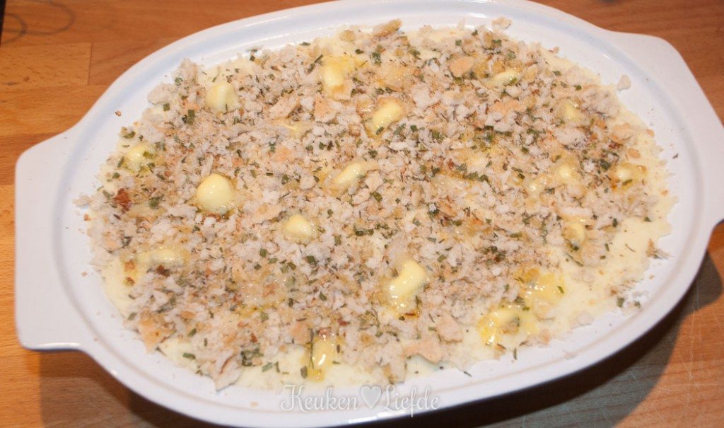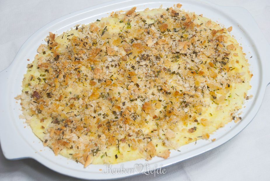 Vet de ovenschaal in en verdeel de helft van de aardappelpuree over de bodem. Bedek met de zuurkool en tot slot de overige aardappelpuree. Bestrooi met het paneermeel en verdeel er wat kleine blokjes boter overheen.