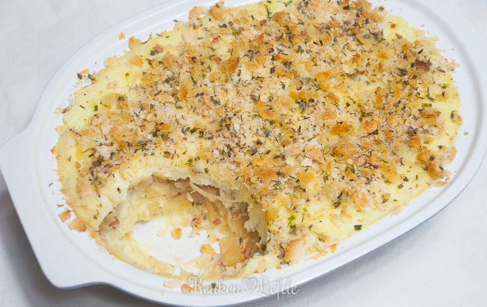 Bak de schotel circa 40 minuten in de oven, of totdat de bovenkant goudbruin is. Laat de schotel voor serveren iets afkoelen.
