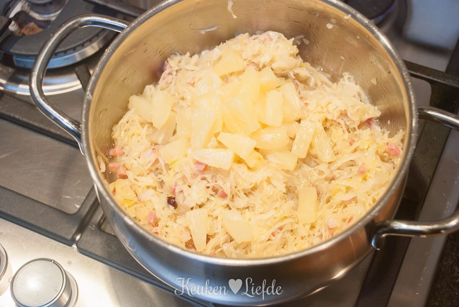 Verhit een pan met wat olie en een klontje boter en fruit op laag vuur de ui, laurier, jeneverbessen en spekblokjes, totdat de ui zacht is. Voeg de zuurkool en ananasblokjes toe (zoveel als je zelf wilt) en roer door het ui en spekmengsel. Breng op smaak met wat versgemalen peper en blus af met de witte wijn. Laat de wijn verdampen en voeg dan een flinke scheut ananassiroop uit het blik toe. Doe de deksel op de pan en stoof de zuurkool op laag vuur, totdat hij heel zacht is. De kooktijd is afhankelijk van hoe zacht je de zuurkool wilt. Ik laat de zuurkool rustig enkele uren sudderen, maar een half uur volstaat ook. Voeg steeds opnieuw wat ananassiroop toe als de zuurkool bijna droog staat. Schil – als de zuurkool bijna goed is – de achtergehouden aardappel en rasp hem heel fijn boven de zuurkool. Roer hem door de zuurkool en stoof nog enkele minuten mee. Door de aardappel wordt de zuurkool fluweelzacht. Verwijder de laurierblaadjes.