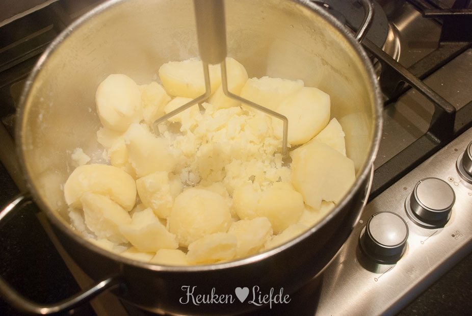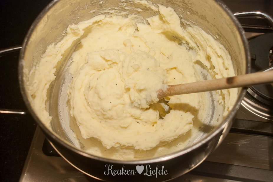 Verwarm de oven voor op 200 graden. Kook de aardappels gaar, giet af en stamp ze fijn. Roer met wat melk en boter tot een smeuïge puree en breng goed op smaak met zout en peper.