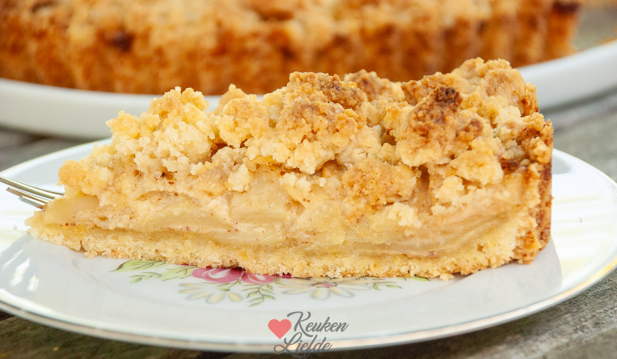 Ik ben dol op crumbledeeg bovenop op een taart. Deze klassieke appeltaart heeft een dakje van krokante notencrumble. Simpelweg verrukkelijk!