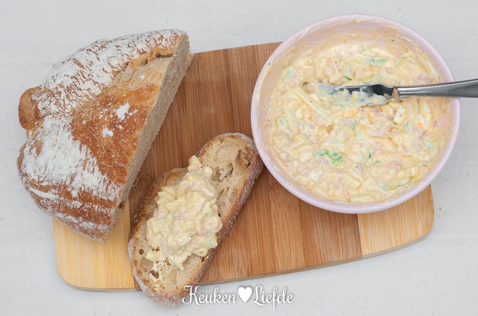 Het recept voor deze eiersalade met gerookte kipfilet en lente-ui heb ik ontfutseld van manlief. Heerlijk om op een versgebakken broodje te smeren.